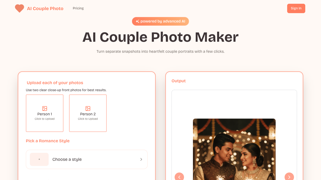 It is an AI-powered tool that merges two individual photos into a single, realistic couple portrait within seconds. It uses neural networks to adjust lighting and balance skin tones, making it appear as though both people were photographed together in the same moment.