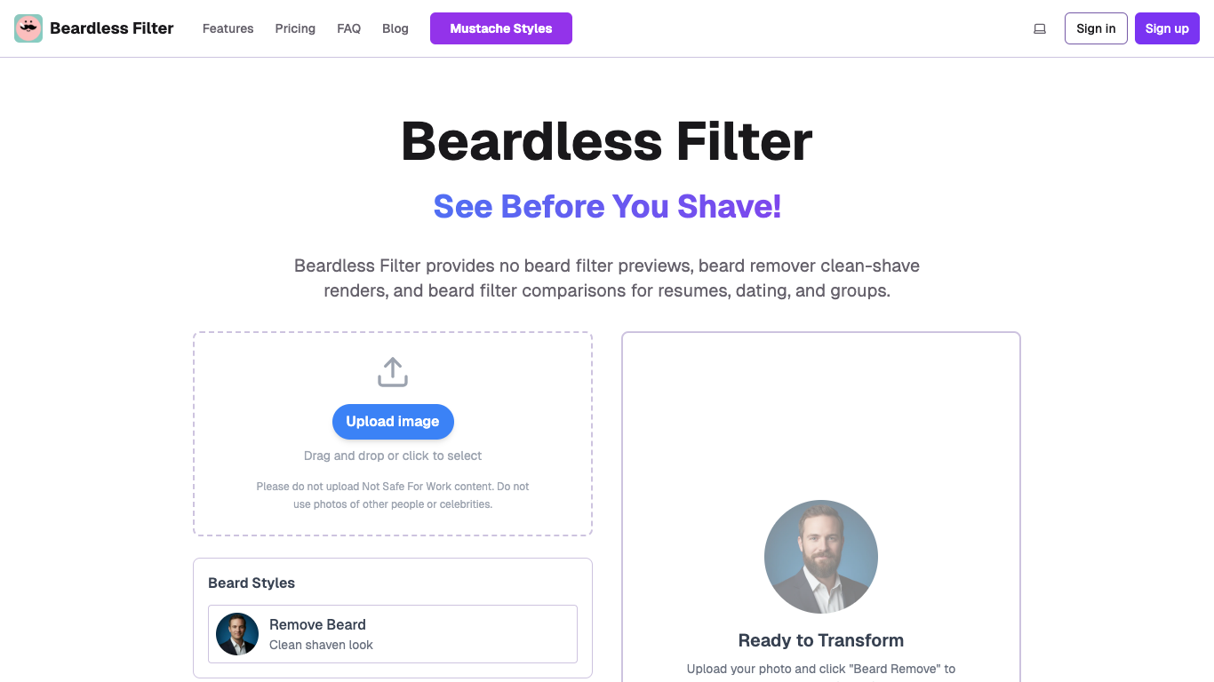 Designed for personal and professional use, Beardless Filter helps users make informed grooming choices, create polished profile pictures, generate fun content, and visualize different looks without the commitment of shaving.