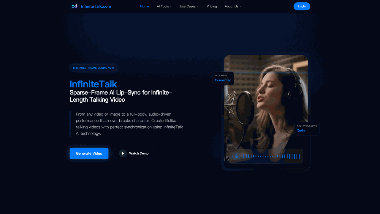 Designed for creators, marketers, educators, and businesses, InfiniteTalk enables the production of high-quality talking videos without time constraints. It supports unlimited video duration, making it ideal for long-form content like podcasts, audiobooks, lectures, and localized marketing campaigns across multiple languages.